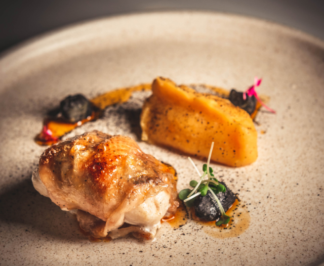 - Plate the fish with the chicken skin next to the pure and the cassava and add a little Ajada on top.